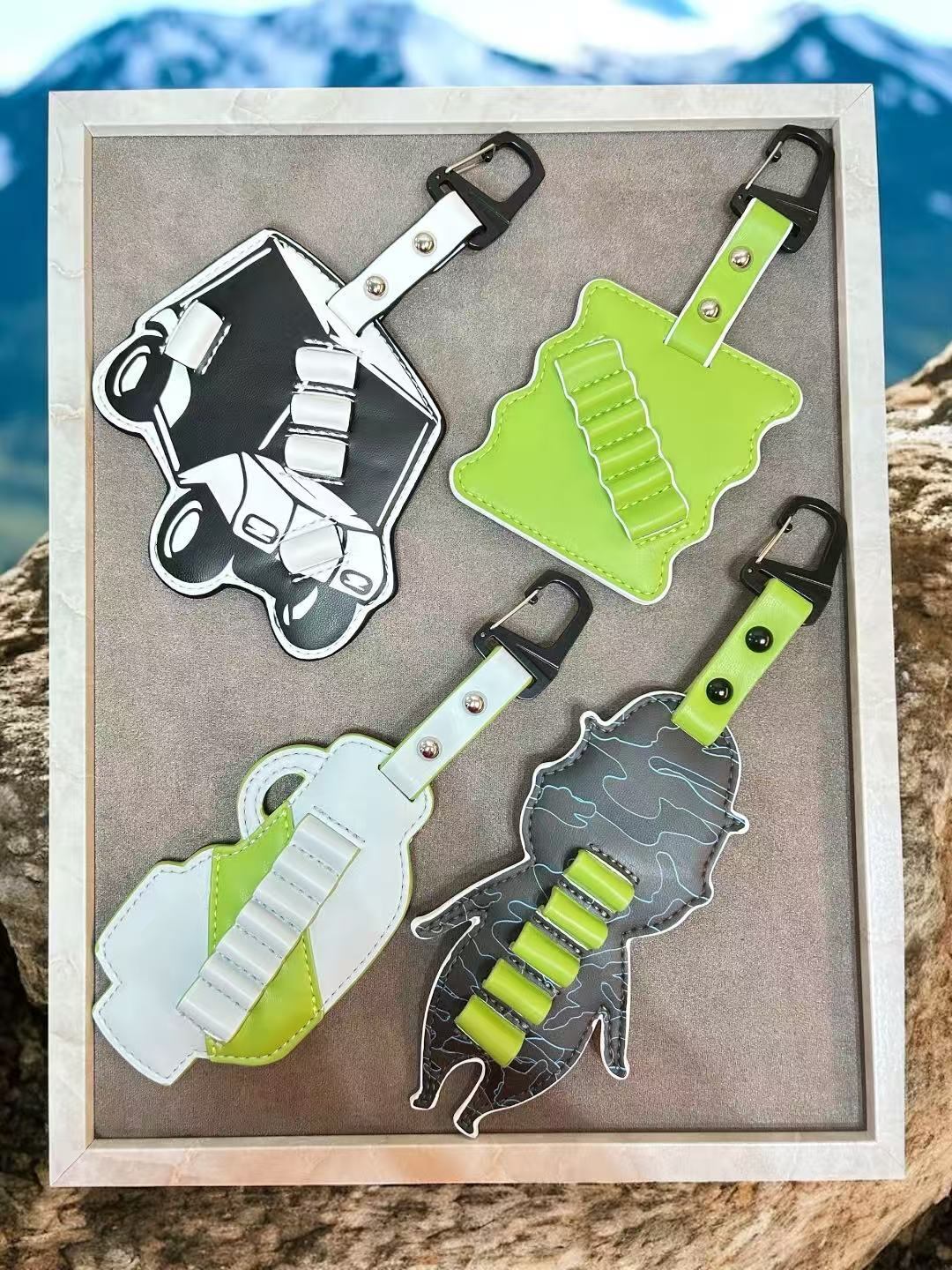 市販の木製ゴルフティーを5,6個装着可能、裏側の丸いゴールドリングにはグリーンフォーク、グローブ、マーカーなどを取り付けられます。プレゼント等にも最適です。